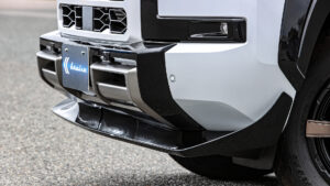 8インチローダウンしたブラックのデモカーに対し、白のデモカーはノーマル車高のまま。装着されるエアロパーツはまったく同じ物だが、車高が変わるだけでまったく違った印象を受けることだろう。ローダウンが似合うように設計されているが、ノーマル〜リフトアップ車にもマッチすると言えるだろう。