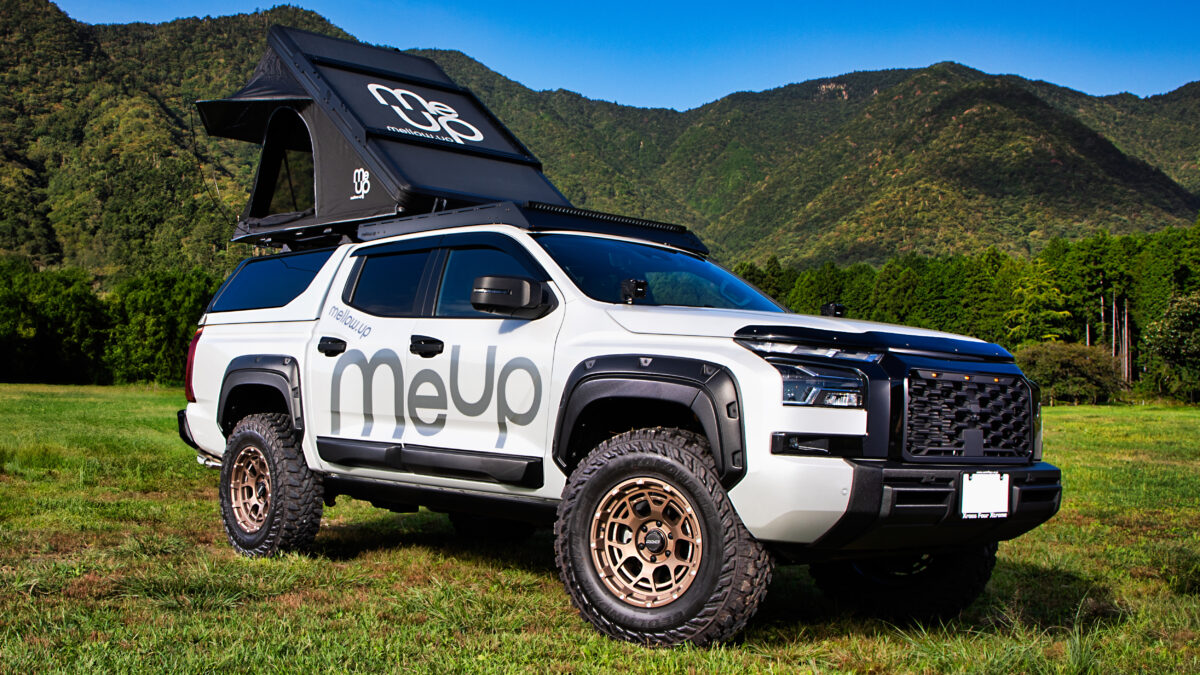 メローアップの最新アイテムのひとつが、正規輸入代理店を務めるMAXLINER社製のキャノピー。キャビン後方から流れるようなスタイリッシュデザインが特長。このキャノピー上部にインストールしているのが、メローアップオリジナルのスリムルーフトップテント。後方からの跳ね上げ式で、軽量かつ堅牢なアルミトップを採用。足下がより広くなり、快適性が向上したものへと進化。