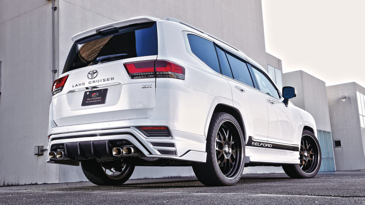 多くのマフラーメーカーとエルフォードの決定的な違いは、マフラーのみの製造ではなく、エアロパーツとのマッチングまで考慮した設計を行なっていること。例えばランクル300やLX600の場合、ノーマルバンパー用はもちろんだが、モデリスタエアロ装着車に適合したモデルをラインナップしている。またテールフィニッシャーの形状もスクエアとオーバルの2種類をラインナップしており、ユーザーの好みに合わせたスタイルを選べるのもポイントだ。