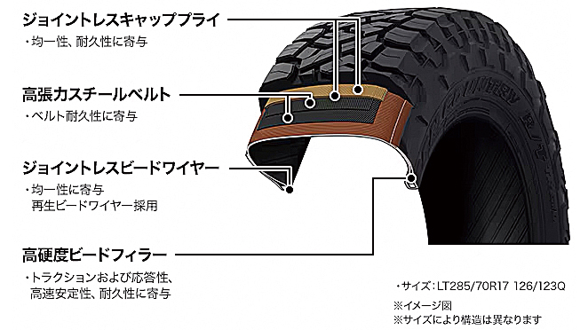 R/Tトレイルはサイドデザインも要注目。トラクションに貢献するバイティングエッジや耐パンク性能や耐外傷性能に効果的なディープバットレスデザインなど、実性能の向上と機能美を感じさせる力強さを両立。一方でその内部にはサステナブル素材である再生ビードワイヤーを採用。さらに高硬度ビードフィラーで高速安定性や耐久性を、ジョイントレスキャップフライで均一性や耐久性を向上している。