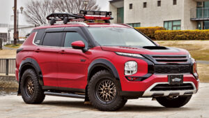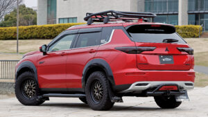 一方、エクストレイルの兄弟車であるアウトランダーPHEVへのカスタムも積極的だ。こちらも基本的にはオールラウンド4WDを意味するAR4スタイルだが、エクストレイルとはまた違った塗り分けカスタムなども披露した。