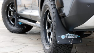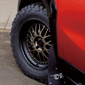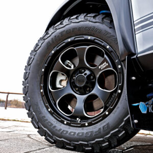 ボディカラーに合わせて、ブルーがアクセントになったブラックのマッドフラップをチョイス。ホイールはエルフォードの新作ブラッドストック・フェイズの18インチをセット。これにBFグッドリッチのAT KO3(LT265/60R18)タイヤを組み合わせて、サイドステップも装着済み。