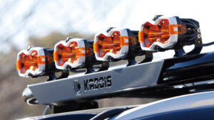 フロントバンパーやルーフラックの先端には、独特な形状と様々な発光パターンが選択できるNOVSIGHTのHALOを装着。