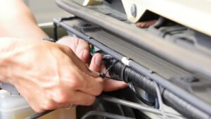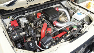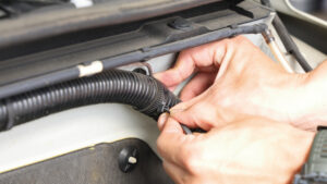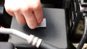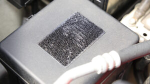 透明被膜のパルス線を固定する。このとき塗装をはがす必要はない。今回はエンジンルームの両端に接続したが室内に配線してもいい。※パルス線をボディに接続する場合は、必ず塗装面を選ぶ。剥き出しの金属部に取り付けると、サビがそこに集まってしまうこともある。