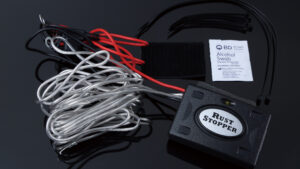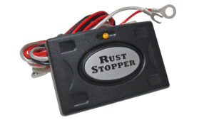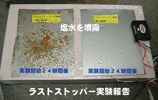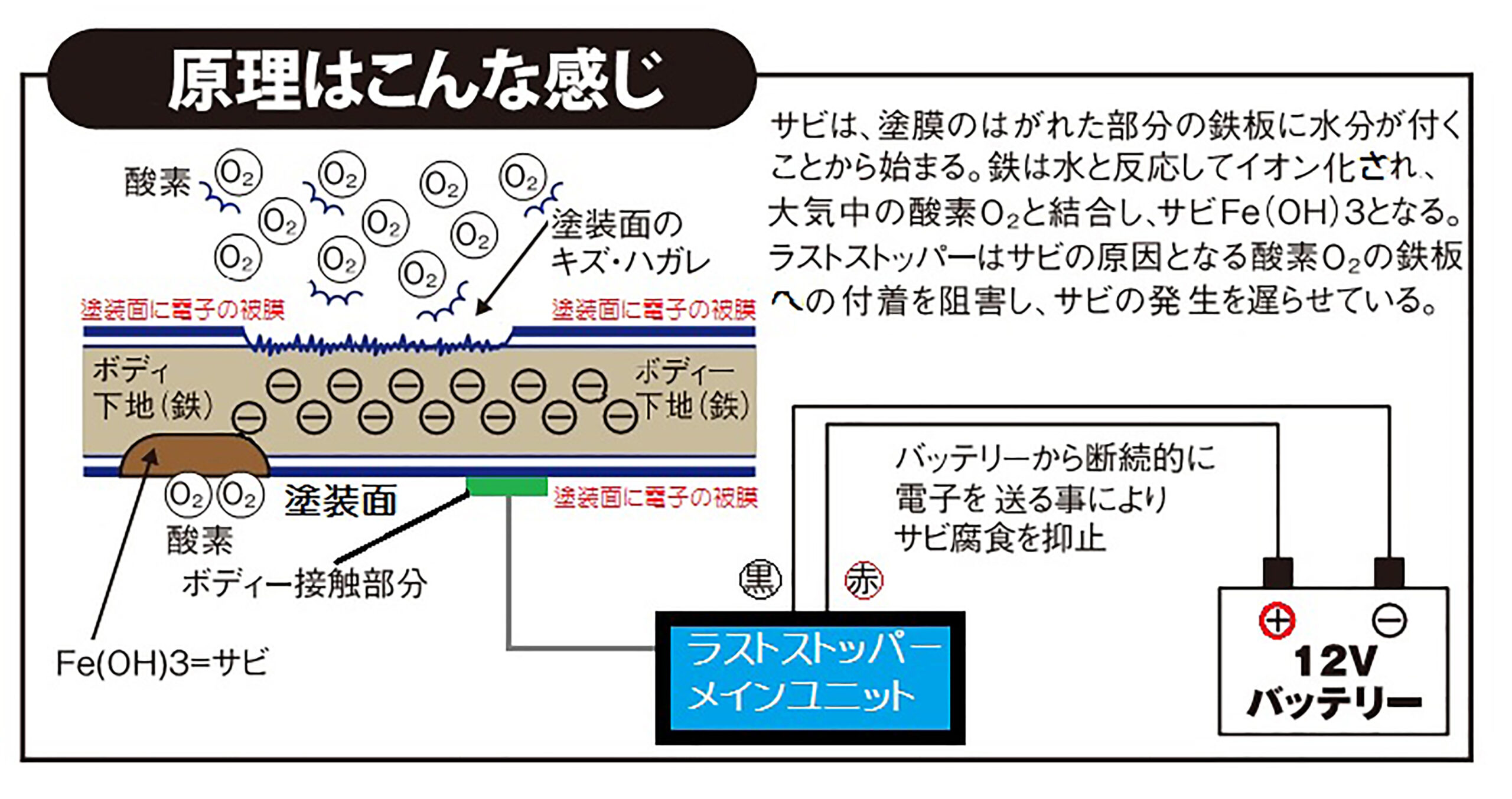 この対策として、テスターでは検出出来ないほどの微弱な電流を塗装の表面に連続的に流すことによって電気的なバリアを張る「ラストストッパー」はこの電気的なバリアによって、ボディへのサビの浸食を防ぎ、さらにサビの発生を防ぐシステム。複数の車ディーラーや装着ユーザーからは、ラストストッパーをつけているとつけない車と数年後ボディの輝きが違うという報告を受けている。これはラストストッパーから継続的に微弱な電流を流すことによって塗装面が電気的なバリアを伴って硬化されていること、塗装部のミクロマクロの穴に電気分解された水分に混ざっていた鉱質の一部が固着してボディを攻撃する要素から守ってくれているからなのだ。