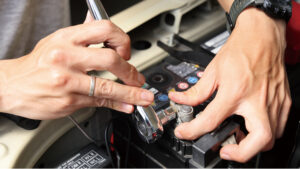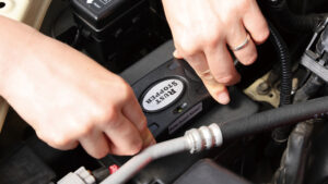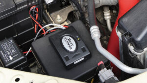 本体から出ている赤と黒の電源線をバッテリーに接続する。赤い線はバッテリーのプラスターミナルに、黒い線をバッテリーのマイナスターミナルに配線する。本体のLEDランプが点灯を見て通電を確認する。※ターミナル接続の際、端子をバッテリーから完全に外さない