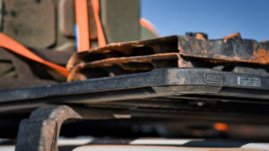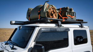 ジムニーはジェリ缶での予備燃料携行がマスト。また車内空間にも限りがあり、テントをルーフラックに積載。こうした時にルーフラックは重宝する。ちなみに最近のルーフラックは様々なオプションやアタッチメントを装着する「Tスロット(ボルトを通す溝)」方式がポピュラーだが、ARBは「蟻継ぎ式」という特殊な方法を採用。砂漠を走行して分かったが、前走車や自車が巻き上げる砂や泥は相当で、特に今回のゴビ砂漠の砂の粒子は細かく、泥は乾燥するとガチガチに固まる。これがTスロットの溝に入ると除去するのが難しく、例えばオプションのタイダウン用フックを移動させようとしても出来ないことも。蟻継ぎ式なら砂や泥の除去も容易なのだ。