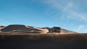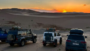 再び走り出した我々を待っていたのは、これまでの地平線とはまるで違う景色。丘と谷が繰り返すアップダウンの道。遠くに馬の群れ、そしてどこまでも続く風の音。ゴビの大地は一瞬として同じ顔を見せないのです。その果てにたどり着いたのが、ゴルバン・サイハン国立公園内のホンゴル砂丘(Hongor Els)。モンゴル最大の砂丘で、幅はなんと約100㎞、高低差300m。某ドラマの撮影地でもあるこのホンゴル砂丘の黄金に輝く砂の海を、ARB装備をまとった4WDが駆け抜ける。夕方、太陽が砂丘を黄金色に染め上げ、風が静まり、誰もが言葉を失うほどの絶景。ホンゴル砂丘の夜は、静かであたたかくて少し切ない…。冒険の終わりが近づく砂の音が、風の中に溶けていきました。