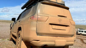 ゴビでは珍しいが降雨した後のマッドセクションは泥もいい具合。表面は固そうに見えても実は粘土質の赤茶色な泥が一帯に広がる。このマッドエリアは流石に本格的な4WDなければ無理だろう。