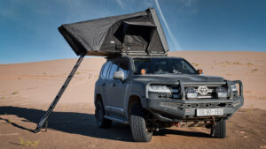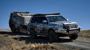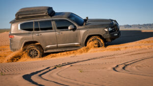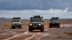 今回のOVERLAND TRIPの参加車両はARBモンゴルチームが全車を用意。アースキャンパートレーラー牽引した車両を含むランクル200が2台、ランクル300、ランクル76、ランクル80、ジムニーで隊列を形成。撮影クルーはランクル78トゥループキャリア×2台で同行するなど、多国籍・多車種が砂漠で交わる壮観なキャラバンとなった。