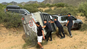 コンボイを組んで車間距離を近くして走りたいところですが、前の車の砂ぼこりが凄くて道が見えない…。そうこうしていると、突然前から2番目を走るランクル200にアクシデント!ARBアースキャンパートレーラーが右側に倒れてしまったのです。力を合わせて押し戻すと、驚くことに外装に致命的な損傷はなく、機能も問題なし。ノープロブレム! まさに「タフで壊れないARB」の品質を身をもって証明する瞬間でした。ただしこれが初日、しかもオフロードに入ってたった1時間でのゴビ砂漠からの洗礼…。この後の旅が少し不安になる瞬間でもありました。