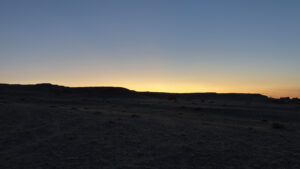 宿泊地を後にし、車列は一気に荒野へ。夜遅くに到着したので気付かなかったけれど、朝起きてビックリ!朝日に照らされた岩山がオレンジ色で美しい…。ここでアスファルトとお別れして、オンロードからオフロードへ。再び冒険が始まります。