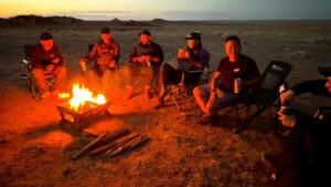 夕暮れが迫る頃にキャンプ地に近い場所で夕食。モンゴルの遊牧民の食事「ホルホグ」は、羊肉ですがアツアツの石を中に入れて調理するスタイル。味付けはシンプルですが、素材そのものを感じられる料理です。その夜の食卓は、国境を越えた一体感がありました。