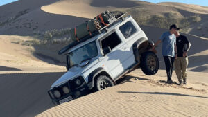 いよいよ、旅のハイライト“ホンゴル砂丘”へ突入! 前日の雨で、泥と砂に包まれたランクル、ジムニー、アースキャンパーはまるでサンドベージュにオールペイントされたような姿。全員で洗車をした後にホンゴル砂丘へ旅立ちます。