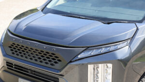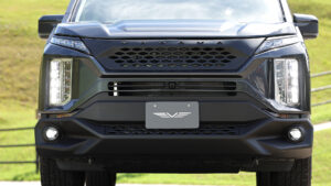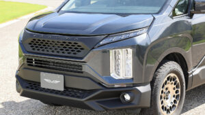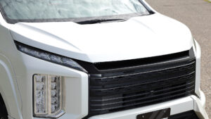 アッパー・センター・ロアの3パーツに分かれた立体的なフロントバンパーは、1ピースでは実現できない高級感を演出する。ヘッドランプがなければデリカD:5とは分からないほどの変貌ぶりだ。