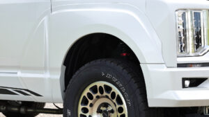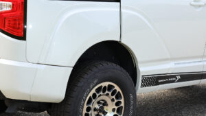 車両のボリュームをアップさせるのが前後フェンダー。フロントは純正交換。リアはボディに装着するが、リアバンパーまでカバーするほどのサイズにすることで9㎜とは思えないほどの迫力あるワイド感を演出している。