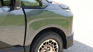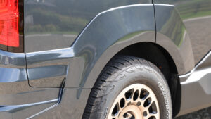 側面に個性を与えるのがサイドパネル。ドアだけでなくフェンダーパネルにも連続するデザインとしており、高い一体感を実現している。フロントドアパネルにはエンボスでVRARVAのロゴを配している。
