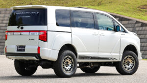まずブラックはVRARVAのパーツでカスタマイズした「ORCUSⅡ(オーカスセカンド)」。同ブランドから今年発表した最新モデルである。ポイントはフロント周り。六角形のグリルやオーバーフェンダーにより、デリカD:5がベースとは思えないほどアグレッシブな印象を与えている。フェンダーをボディに溶け込ませるサイドパネルやドアハンドル、Cピラーに施された専用パーツにより完成度は圧巻。それでいて車検にも対応しているのだから驚きだ。
