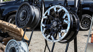 MGやdeanなど、タフさやワイルドさを演出できるホイールを展示。D:5の場合、どのサイズ選ぶか悩ましいところだが、デザインやカラーなど個性的なモデルを多数ラインナップするので、好みのが見つかるハズ。(https://www.crimson-inc.co.jp/)