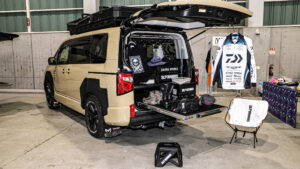 ランクルやハイエースだけでなく、D:5のカスタムカーも販売を開始したフレックスドリーム。ペンドルトンとコラボしたシートカバーやARBのサイドオーニングを装着したデモカーを展示。注目はセカンドシートを対面にできるMONOBOXシートで、D:5を所有している人も注目していた。(https://www.flexdream.jp/)