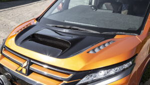 グリルとバンパーの一部をカバーするフェイスマスクTYPE-3の装着で、シャープなフロントビューを演出。またダイナミックシールドを強調する、縦型4発LEDのアクティブランプパネルも装着。エアロボンネットはフレッシュエアを取り込みつつ、エンジルーム内の熱を排出するアウトレットダクト付き。