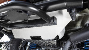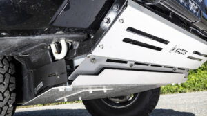 フロントバンパーの下部に収まるフロントLEDバーはアルミのスキッドプレートが付属する。その奥に装着されるアンダーガードはアルミ製で、これはWalkerSupplys4インチアップ装着車専用アイテムとなる。リアはトレイルヒッチPREMIUMに付属するアドブルータンクガードが無骨なスタイルを演出する。