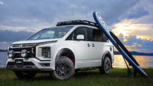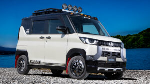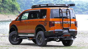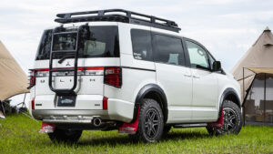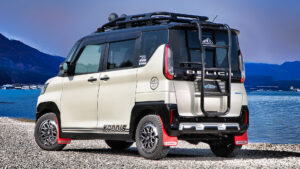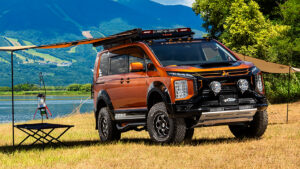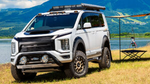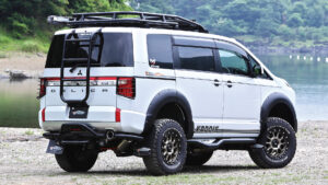 そしてもう1台のデモカーがデリカミニ。35㎜アップのサスペンションキットにルーフマーカー、ルーフレールラックなどをラインナップし、その設計や材質はD:5用のそれを踏襲。デザインや使い勝手だけでなく、コストパフォーマンスにも優れたものとなっている。