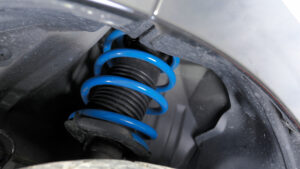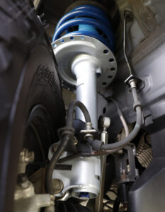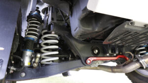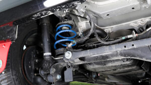足回りはアップコイルで1インチアップし、サスアシストキットでアライメント補正を行なう。