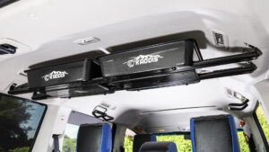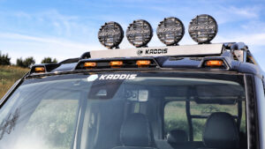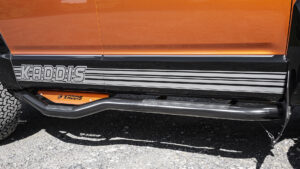 まるで純正品のごとく美しい造形美を見せるルーフマーカー。ひとつのランプに3つのLEDを使った5連のルーフマーカーとなっている。高い技術による後部の曲げ加工がデザイン上のアクセントになると同時に、乗降性を向上させるのがサイドステップPREMIUM。さらにデザインプレートも付く。