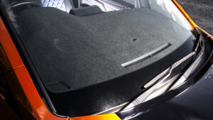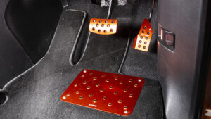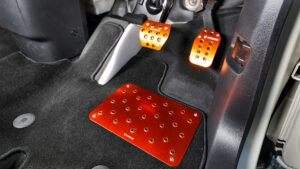 フロントガラスへの映り込みを軽減するダッシュマット、室内の頭上空間を有効活用するルーフポケットダブルを装着。滑りにくくスタイリッシュな運転席の足もとを演出するアルミペダルセット&ヒールプレートも人気。