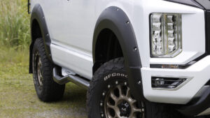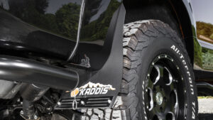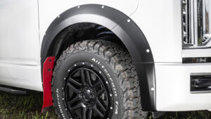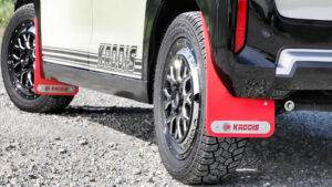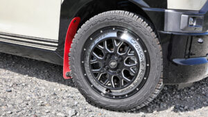 AR4オーバーフェンダーはフロントが30mm、リアが25mmワイドとなる。タイヤはBFグッドリッチのA/T KO3(LT265/75R16)で、ホイールはBloodstockの1piece(16×8.0J+13)マットブラック・ミル。マッドフラップはステンレスハンガー&ワイヤー付きで、ブラックカラーのほか、レッドとブラウンを用意。