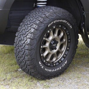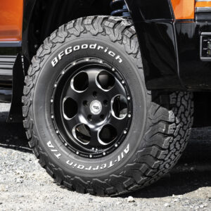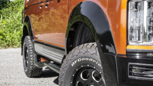 BFグッドリッチ・ オールテレーン KO3(LT265/70R17)にMKW M204 JP Spec(17×8.0J+38)を組み合せ、デモカーは25㎜ワイドトレッドスペーサーを装着。アルミのフェイクリベットをあしらった30㎜ワイドのオーバーフェンダーを採用する。
