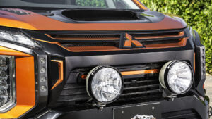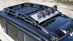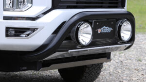 フロントのバンパーガードはフジヤマPREMIUMに専用のライプステーを介して大型フォグを装着。サイドステップは高い技術による後部の曲げ加工を施したサイドステップPREMIUM、さらにトレイルヒッチPREMIUMとルーフマーカーを装備する。