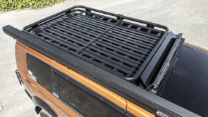 太めの50φのアルミパイプを使用した無骨なデザインのパイピングと、フロントからキックアップスタイルとしたルーフレールラック。専用のディフレクターをオプションで用意。またここへのアクセスを容易にするリアラダーPREMIUMは45φサイズのアルミパイプを使用。