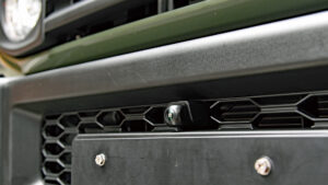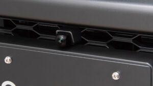 トピックとなるのはロアグリルへのさりげない取り付け。ハニカム構造のロアグリルを前後から挟み込んで固定するカメラカバーを専用設計し、無骨なカメラステーが飛び出すこともなくスマートに、視認性の高い位置にカメラを設置できるのが魅力。グリルの全長が異なるジムニー用とシエラ/ノマド用を別途用意している。