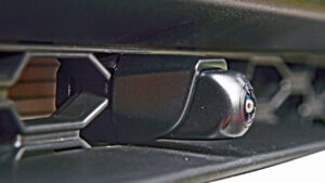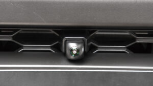 カメラカバーはロアグリルのハニカム構造を前後から挟み込む形で固定している。裏側から見るとハニカムにカメラカバーがフィットして違和感なく取り付けられているのが分かる。ケーブルも後方から取り回すので目立たずスマートな仕上がりとなる。