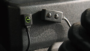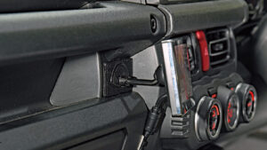 コンパクトなコックピットのジムニーはダッシュ上にモニターを設置すると視界が遮られる心配がある。そこでデータシステムが開発中なのがグローブボックスの上部に取り付けられるモニターステー(開発中)。同社のスーパースリムモニター(SSM-W5.0Ⅱ)を取り付けることができ、フロントカメラ映像の常時表示するのにも最適だ。
