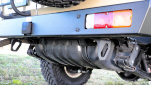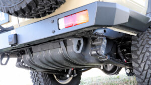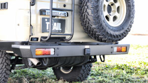 フロントのウインチバンパーと同じテイストのリアバンパーwithヒッチ。2インチ口のヒッチメンバーが一帯となる標準装備。テールランプは純正を移設して流用。リア牽引フック(左右)と汎用150mm&120mmヒッチアダプターを別売りで用意。