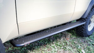 フレームにボルトオン装着が可能なGDJ76用サイドガードステップ。堅牢なスチール製でステップ上部は取り外しが可能。未装着時はロックスライダー風のデザインで、天板は滑り留め加工が施されている。