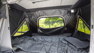 耐久性、耐候性に優れるハードカバーのルーフトップテントRTT-Q501。垂直ポップアップ式なので、空間効率に優れる広さを実現。同時にルーフ面積以上の占有スペースを必要としない。収納時は25cmの厚みに収まる。