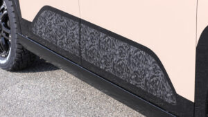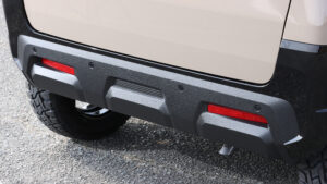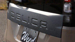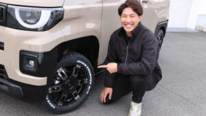 超新型デリカミニを、早速カスタマイズ。リアの大きなガーニッシュや、前後バンパーの中央、フォグランプベゼルにラプターライナーを施工し、タフな雰囲気を主張。サイドデカールは試作品だ。