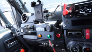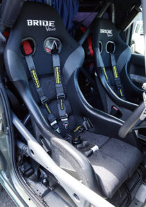AXCRマシンのコクピットはメーターやエアコンスイッチなども含め、いい意味で純正然としている。ナビ部分は加工されキルスイッチやメーターが固定され、さらにコ・ドライバー側にはラリーコンピューター用ホルダーやマップ修正用のペンホルダーなどを用意。ブリット製のフルバケタイプのシートに6点式シートベルトを装備。ステアリングはオリジナルを開発中の革巻きのセミディープコーンに換装してある。