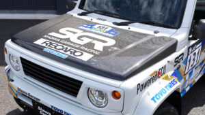 各種装備や補強で重量はノーマルより増しているため、ボンネットは軽量化のために自社カーボン製に換装。グリルは耐衝撃性に優れたABS素材のスポーツグリルで、シャープな目つきになるアイラインタイプに交換。なおウインカーやリアのテールランプなどはすべてショウワガレ—ジ製のLEDパーツに換装している。