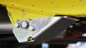 AXCRマシンのフレームはあえて黄色にペイントされている。これはオイル漏れやクラックをいち早く見つけるため。また補強は外側だけでなくフレームの内部にまで行なわれている。意外にシンプルに思われるかもしれないが、燃料、キャニスター、アームピボット、そしてスキッドプレートなどにガード類を装備。マッドフラップはワンオフ品。