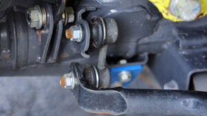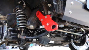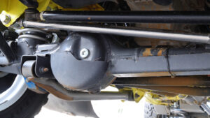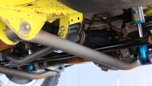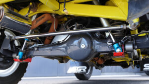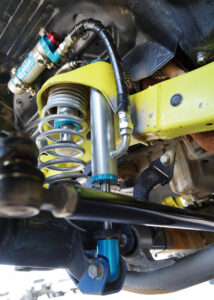 サスペンションは市販品のSGアジャストコイル50だが、ハイスピード走行に対応すべくリザーブタンク付きのKINGショックを選択。ここに自社製大容量バンプとKINGショック製のエアバンプをセット。スタビライザーは純正だがスタビリンクは自社製に交換し、前後アームも自社製の強化アームに換装済みだ。さらにフロントには大容量8の字バンプラバー、リアに大容量バンプラバーを装備し、ラテラルロッドの取り付け部やホーシングもすべて補強されている。