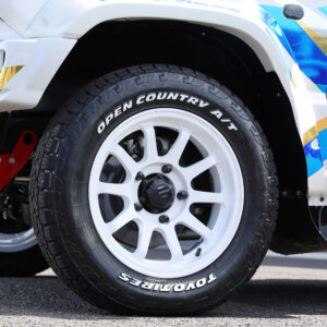 トーヨータイヤ・オープンカントリーA/TⅢは、高いトラクション性能とコントロール性がありながら、市街地も静かに快適に走れる万能タイヤ。スノーフレークマーク付きで雪道も走行可。ホイールはAXCRマシンと同じ。