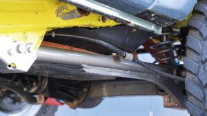 サスペンションは市販品のSGアジャストコイル50だが、ハイスピード走行に対応すべくリザーブタンク付きのKINGショックを選択。ここに自社製大容量バンプとKINGショック製のエアバンプをセット。スタビライザーは純正だがスタビリンクは自社製に交換し、前後アームも自社製の強化アームに換装済みだ。さらにフロントには大容量8の字バンプラバー、リアに大容量バンプラバーを装備し、ラテラルロッドの取り付け部やホーシングもすべて補強されている。
