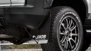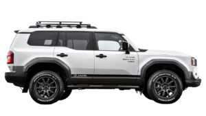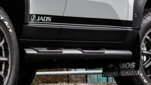 ランドクルーザー250のサイドビューには、JAOSカスタムの方向性が端的に表れている。過度に上げすぎないリフト量は前後のバランスがよく、走破性と日常の扱いやすさを両立した“ちょうどいい”設定だ。ホイールとオフロードタイヤの組み合わせも自然で、フェンダーとのクリアランスから十分なストローク確保が読み取れる。フェンダーガーニッシュはボディに力強さを与えつつ実用性も兼備し、サイドステップやプロテクション類は乗降性とオフロード性能への配慮を感じさせる。全体のラインは純正の造形を活かしながら統一感を持って仕上げられており、見た目の迫力だけではない“走るためのデザイン”であることをさりげなく語っている。