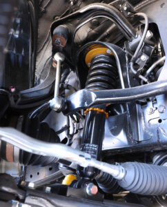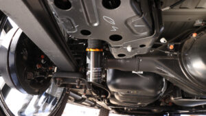 エアサスメーカーのAir-Force(エアフォース)と共同開発した特別な車高調を使ってフロント150㎜、リヤ130㎜ものローダウンを実現。さらに低さを追求するため、薄型のバンプストッパーに変更するなど駆サスペンションカスタムを実施。またリヤサスペンションはリーフスプリングもシャックルもノーマルだが、アンダースラング化(ホーシング逆付け)を実行。ここまでの低さを追求しながら、構造変更が不要というのはユーザーにとって嬉しい限り。