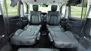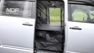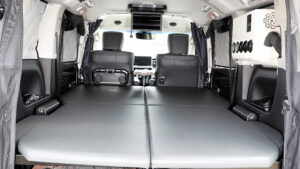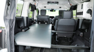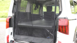 セカンドシートからサードシート部分を、4枚のベッドボードと堅牢なスチールフレームで簡単に設置できるベッドキット。大人2名が就寝可能。